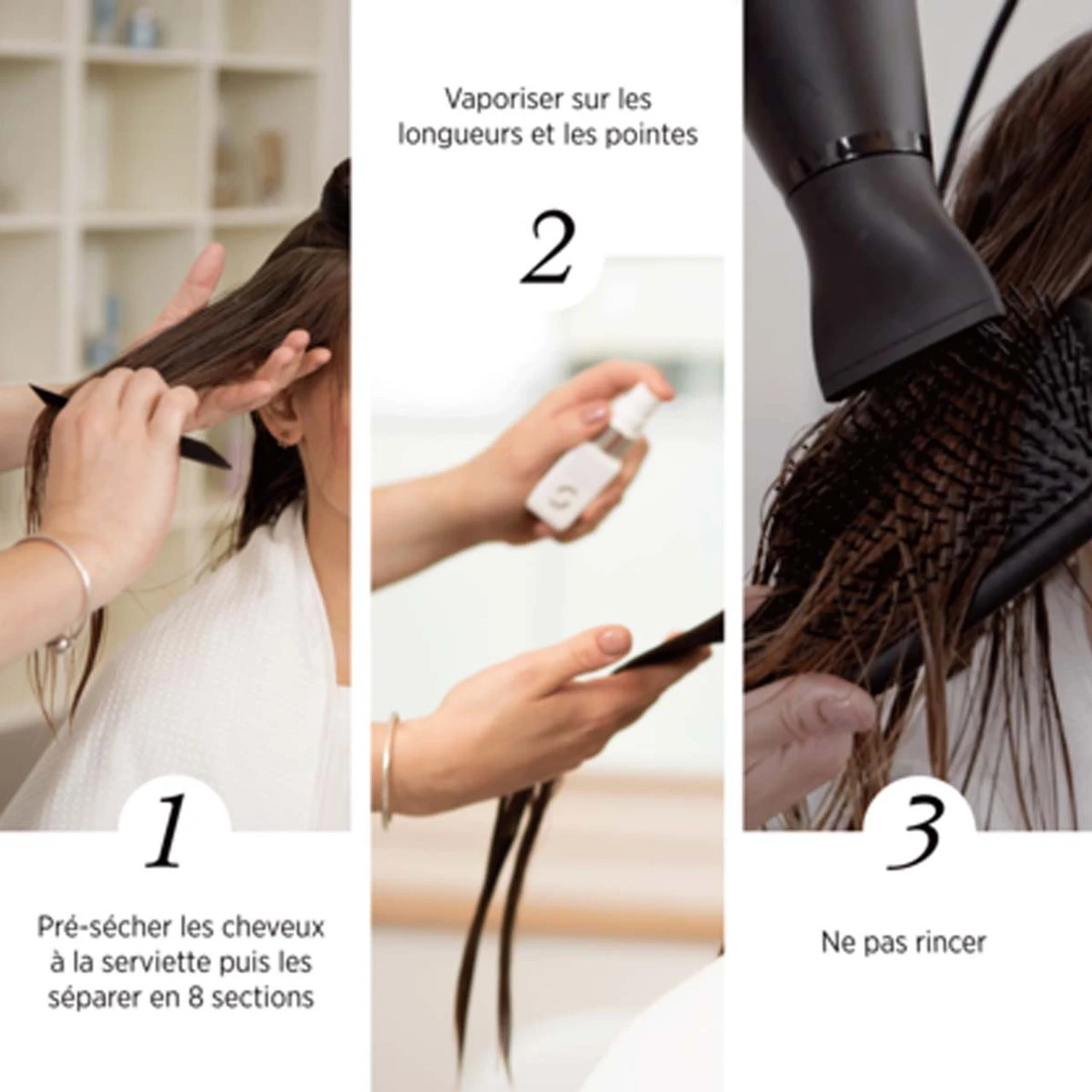 – Vaporiser uniformément sur les longueurs et pointes, sur cheveux pré-séchés à la serviette.