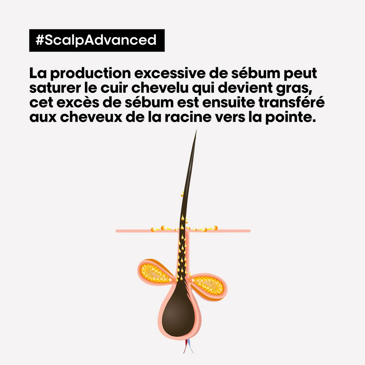 la pollution, le stress et une mauvaise alimentation favorisent l’excès de sébum qui peut saturer le cuir chevelu. Cet excès de sébum est ensuite transféré aux cheveux de la racine vers la pointe créant cet effet gras. Le shampoing dermo- purifiant Scalp Advanced va venir atténuer ce phénomène.