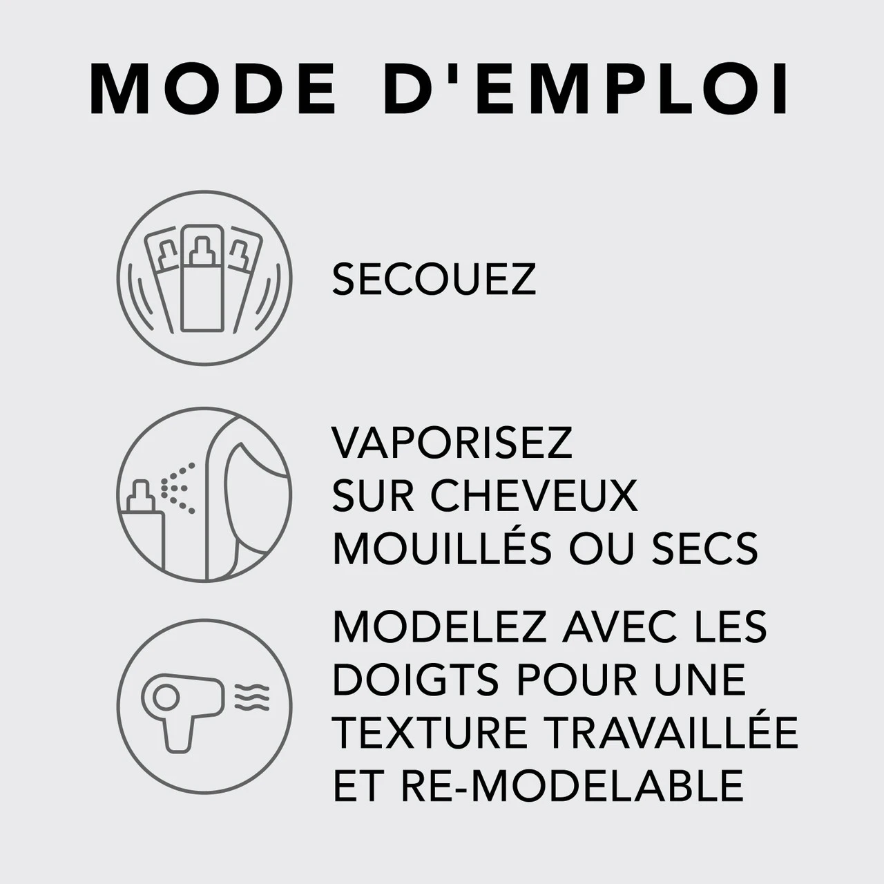 – Vaporisez sur cheveux humides avant de sĂ©cher au sĂšche-cheveux pour une tenue et une texture Ă©bouriffĂ©e